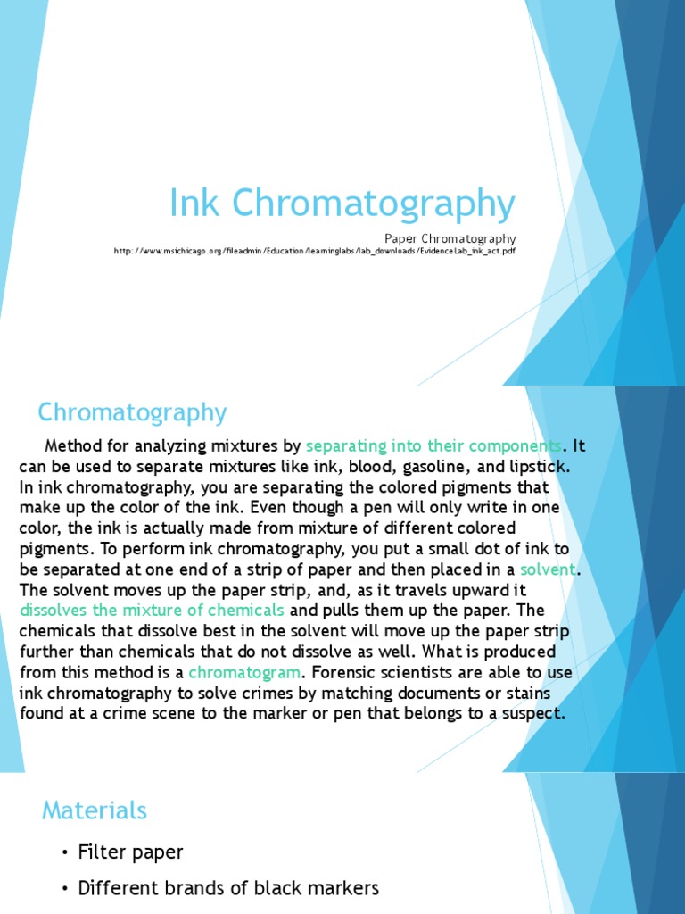 Ink Chromatography Ink Chromatography Definition chromatography is used to separate mixtures of substances into their components. chromatography is a method for analyzing mixtures by separating them into the chemicals from which they are made. chromatography is a separation technique used to separate mixtures of soluble substances. chromatography is a method by which a mixture is separated by distributing its components between. Ink Chromatography Definition.
